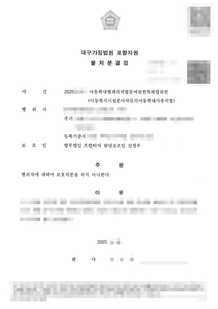 이처럼 아동학대 사건에 연루될 경우, 특히 교사나 보육교사 등 아동복지시설 종사자는 직업의 특성상 일반인보다 훨씬 무거운 법적 책임을 질 위험이 높습니다. 본 사건과 같이 혐의를 벗고 불처분 결정이라는 최선의 결과를 얻기 위해서는 반드시 포항아동학대변호사의 전문적인 조력이 필요합니다.