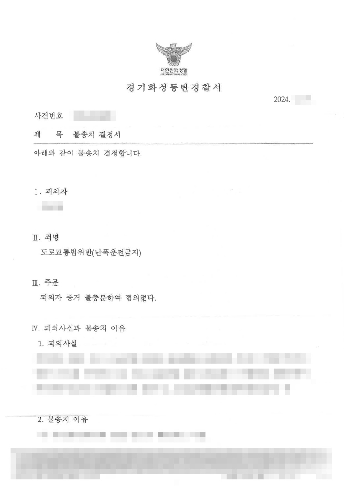 다만, 피의자의 진로 변경 및 급제동 금지 위반 등 일부 교통 위반 행위는 명확히 확인되었으므로, 형사 처벌(난폭운전죄) 대신 행정처분(범칙금 및 벌점 등)을 부과하고 사건을 종결했습니다. 이는 난폭운전이라는 중한 형사 처벌 대신 행정적인 책임만 부담하게 된 결과로, 피의자에게는 최선의 결과라고 볼 수 있습니다.