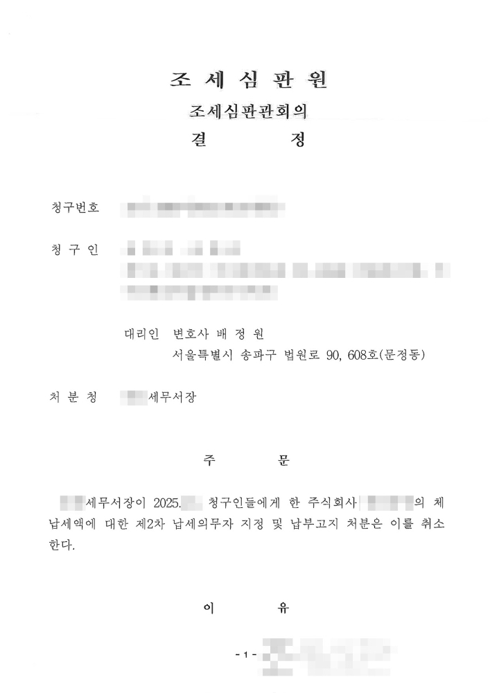 부산조세전문변호사가 조력한 이번 사건은, 주식회사 A(이하 '체납법인')의 발행주식을 보유하고 있는 B와 C(이하 '청구인들')가 체납법인의 체납세액에 대해 제2차 납세의무자로 지정 및 납부고지를 받은 것에 대한 취소 결정입니다.