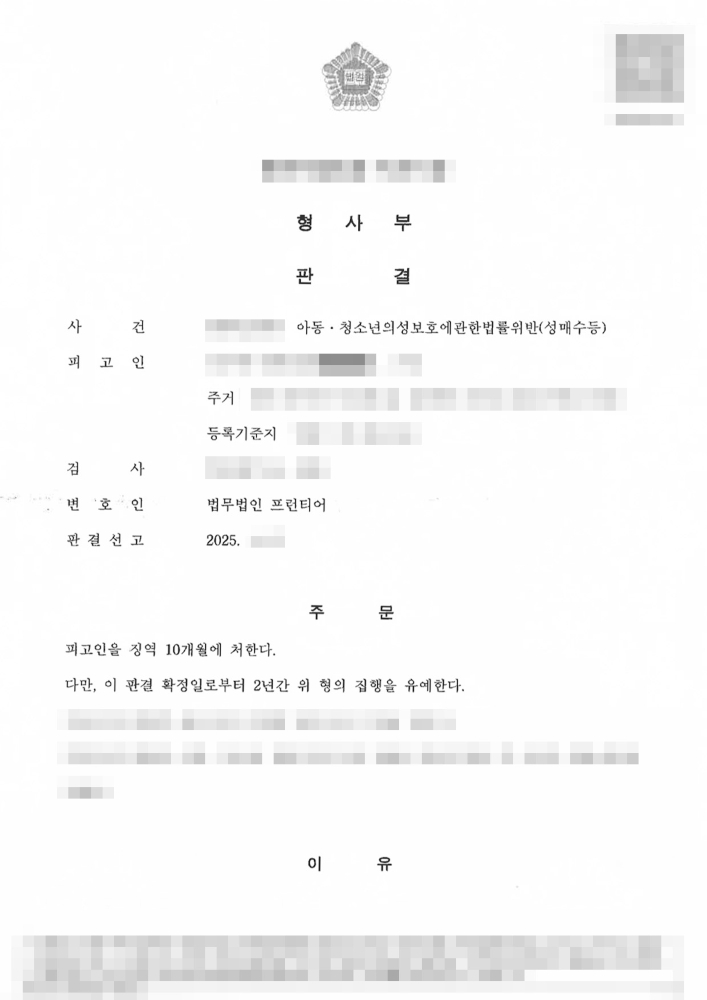 따라서 실형의 위험이 매우 높았고, 직업과 미래를 잃을 수 있는 절박한 상황에서 인천아청법위반변호사의 전문적인 법률 조력이 필요했습니다. 특히 아청법 위반 사건은 단순 성매매와 달리 처벌 수위가 매우 높고, 신상정보 등록 및 취업제한 명령 등이 함께 부과되기 때문에 초기부터 인천아청법위반변호사의 철저한 방어가 중요합니다.