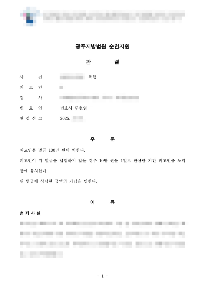 여수폭행변호사의 조력을 받은 피고인 A는 주차 문제로 시비가 붙어 피해자를 폭행한 혐의로 기소되었으나, 법원에서 비교적 낮은 수준인 벌금 100만 원을 선고받으며 사건을 성공적으로 마무리했습니다.