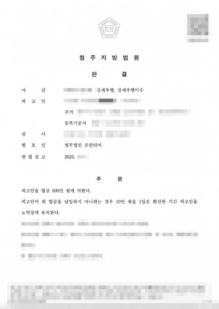 청주성추행변호사의 조력을 받은 피고인은 회사 대표라는 우월적 지위를 이용하여 직원인 피해자를 수차례 강제추행 및 강제추행미수한 혐의로 기소되었으나, 구속이나 징역형의 집행유예 없이 비교적 낮은 형량인 벌금 500만 원을 선고받으며 사건을 성공적으로 방어했습니다.