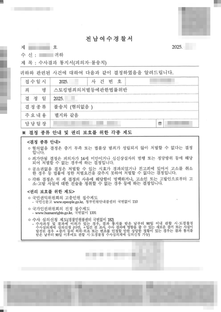 따라서, 피의자의 행위는 스토킹 범죄에 해당하지 않는다고 판단되어 불송치(혐의없음) 결정을 내렸습니다. 이 사건과 같이 복잡한 남녀관계 등이 얽혀 스토킹 혐의를 받게 될 경우, 행위의 '지속성/반복성'이나 '정당한 사유'를 입증하여 불송치를 이끌어내는 것은 매우 까다롭습니다.