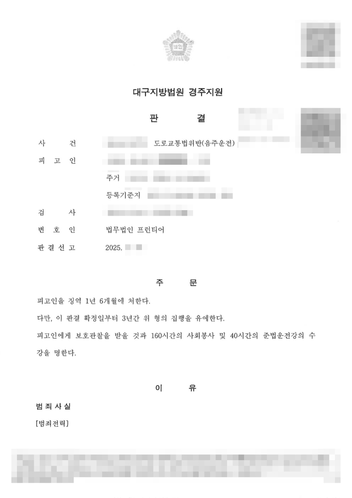 이처럼 피고인은 동종 전과가 수회(집행유예 1회, 벌금형 3회) 있는 상태였고, 비교적 높은 혈중알코올농도 수치로 운전하여 죄질이 가볍지 않은 상황이었습니다. 해당 사건에서 피고인은 법무법인 프런티어 소속 경주음주운전변호사의 조력을 받아 사건을 진행했습니다.