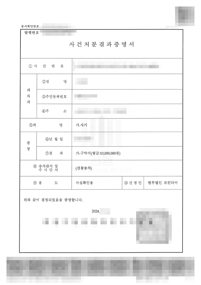 부산해운대사기죄변호사의 전문적인 조력은 고소인이 제기한 사기 사건에서 피의자에게 구약식 벌금 1,000만 원이라는 명확한 형사처벌을 확정시키는 결정적인 결과를 낳았습니다. 피의자는 사기죄로 유죄 판결과 동일한 효력을 가지는 벌금형을 선고받게 되었습니다. 검찰이 구약식을 결정했다는 것은 피의자의 사기 혐의와 기망의 고의가 충분히 입증되었음을 의미하며, 이는 부산해운대사기죄변호사가 제출한 증거와 논리가 수사기관을 완벽하게 설득하는 데 성공했음을 방증합니다. 비록 정식 재판을 거치지 않았으나, 벌금 1,000만 원은 피의자의 전과 기록에 남게 되며, 이는 향후 피의자에게 법적·사회적 책임을 묻는 중요한 근거가 됩니다.