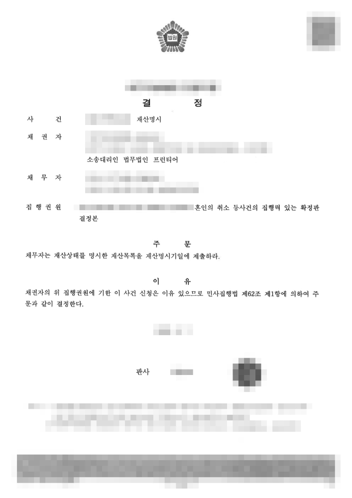 채권자는 앞서 진행된 혼인의 취소 등 사건에서 승소하여 집행력 있는 확정판결 결정본을 확보했습니다. '혼인의 취소' 소송은 단순한 이혼이 아니라 법률적으로 혼인 자체를 소급적으로 무효화하는 강력한 효력을 가지며, 이는 당사자 간의 재산적 청산 의무를 발생시키는 핵심 사유가 됩니다. 특히 본 사건은 사실상 혼인관계 해소에 따른 금전적 청구권(주로 위자료, 또는 재산분할과 유사한 법적 청산금)이 핵심이었으며, 법원의 확정 판결은 채무자로부터 해당 금전적 이행을 받아낼 수 있는 강력한 '집행권원'이 됩니다. 그럼에도 불구하고 채무자가 판결에 따른 금전 지급 의무를 자발적으로 이행하지 않거나, 자신의 재산을 은닉하여 채권자가 그 소재를 파악하기 어려운 상황이 발생했습니다.