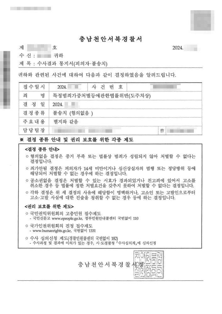 최종적으로 경찰은 의뢰인에게 적용되었던 특정범죄 가중처벌 등에 관한 법률 위반(도주치상) 혐의에 대해 '불송치(혐의없음)' 결정을 내렸습니다. 이는 검찰로 사건을 송치하지 않고 경찰 수사 단계에서 사건을 종결하며, 의뢰인이 범죄 혐의가 없음을 공식적으로 인정받았음을 의미합니다. 만약 이 사건이 검찰에 송치되어 기소까지 이어졌다면 의뢰인은 실형을 포함한 중형을 피할 수 없었을 것입니다. 그러나 천안도주치상변호사의 신속하고 전문적인 대응 덕분에 의뢰인은 형사 처벌을 면했을 뿐만 아니라, 장기간의 법적 다툼에서 벗어나 일상으로 복귀할 수 있게 되었습니다.