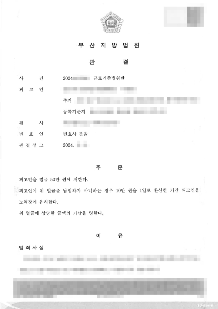 부산근로기준법위반변호사가 조력하여 벌금 50만 원의 가벼운 처벌을 이끌어낸 이 사건은, 피고인이 사업주로서 근로기준법 제26조(해고 예고)를 위반하여 근로자에게 해고예고수당을 지급하지 않은 혐의로 기소된 형사 사건입니다.