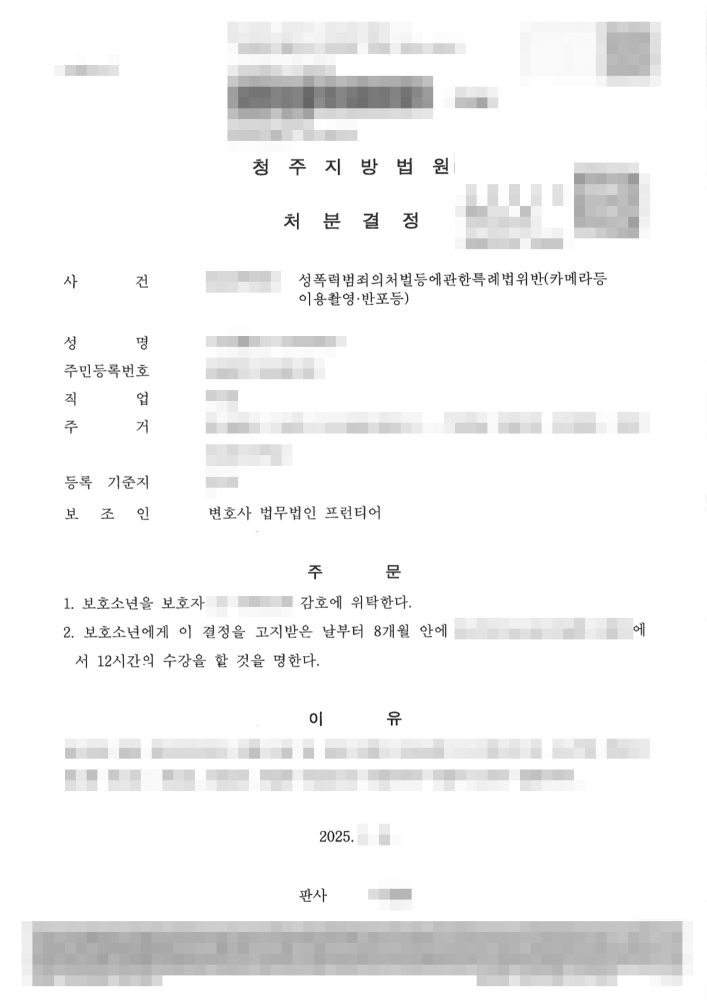 전문가 의견 제시 및 최적 처분 요구: 포항소년사건변호사는 보호소년에게는 격리 처분보다 가정 내에서 보호자의 감호와 전문적인 상담 교육(수강명령)을 병행하는 것이 교화에 더욱 효과적이라는 전문가 의견을 제시했습니다. 결과적으로 보호소년의 범행은 성폭력처벌법 위반에 해당하여 엄중한 처분이 불가피했지만, 포항소년사건변호사의 헌신적인 조력 덕분에 소년에게 가장 유리한 처분인 보호자 감호 위탁과 수강명령으로 사건을 이끌어갈 수 있었습니다.