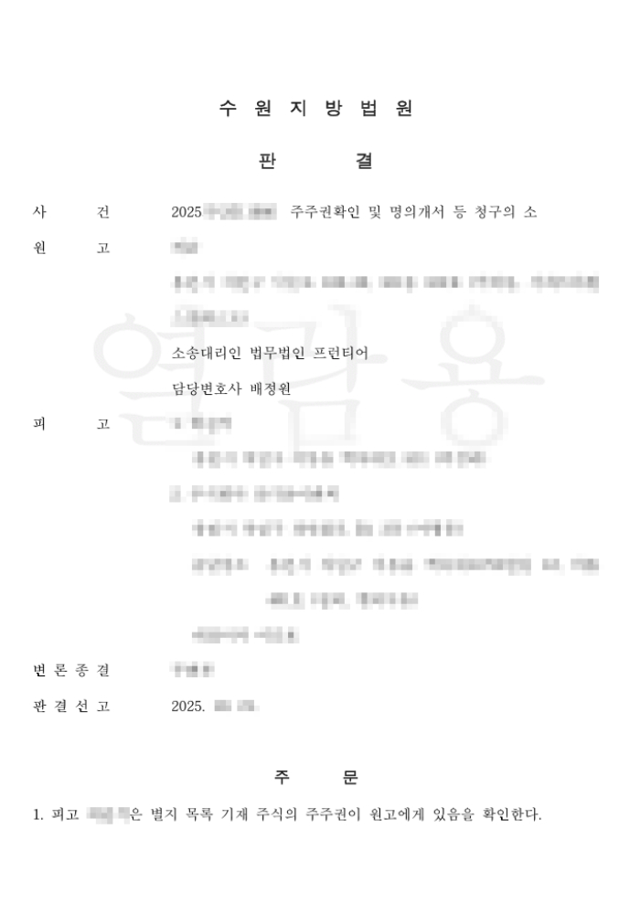 송파민사소송변호사 주주권확인 및 명의개서 청구 성공 사례
