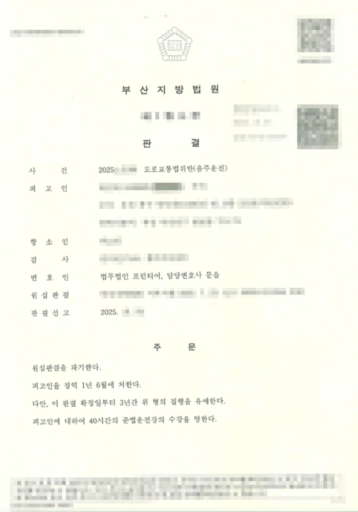항소심 재판부는 변호인의 주장을 면밀히 검토한 끝에, 원심의 양형이 다소 무겁다고 판단하였습니다. 법원은 동종 전력이 있기는 하나 이전 처벌이 모두 벌금형이었다는 점을 주요 판단 근거로 삼아 이번에 한하여 집행유예를 선고하는 것이 타당하다는 결론에 이르렀습니다. 이처럼 음주운전 항소심에서는 유리한 정상을 신속하고 체계적으로 수집·제출하는 변호인의 역할이 결과를 크게 좌우하며, 부산음주운전변호사의 전문적인 조력이 실형과 집행유예를 가르는 결정적인 역할을 하였습니다.