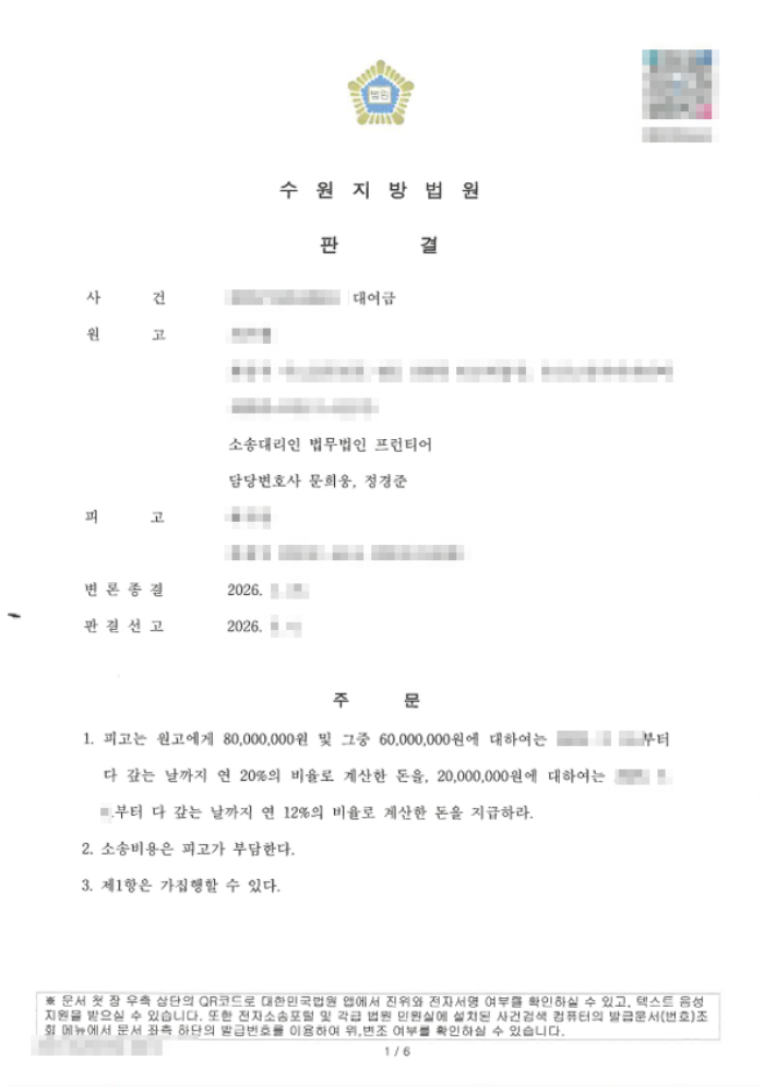 구체적으로 원고는 피고에게 6,000만 원을 이자 연 20%로 정하여 대여하였고, 이후 추가로 2,000만 원을 대여하여 총 대여 원금은 8,000만 원에 달하였습니다. 원고 측 소송대리인 법무법인 프런티어 담당 변호사는 사건을 수임하여 원고의 권리 회복을 위해 적극적으로 소송을 수행하였습니다.