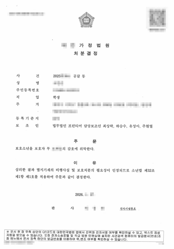 법무법인 프런티어는 보호소년의 성장 환경과 개인적 사정을 면밀히 파악하고, 향후 재범 방지와 올바른 사회 복귀를 위한 최선의 처분이 이루어질 수 있도록 적극적으로 사건에 임하였습니다.