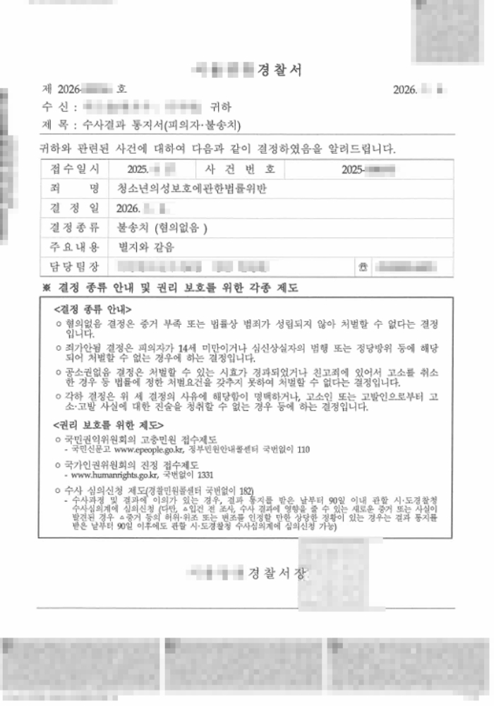 청주성범죄전문변호사의 체계적이고 적극적인 변호 활동 결과, 수사기관은 본 사건에 대해 불송치(혐의없음) 결정을 내렸고, 의뢰인은 검찰에 사건이 넘겨지지 않은 채 수사 단계에서 완전히 혐의를 벗게 되었습니다.