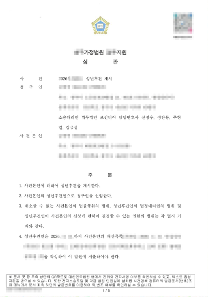 심판의 주요 내용으로는 사건본인에 대한 성년후견 개시, 청구인을 성년후견인으로 선임, 취소할 수 없는 법률행위의 범위 설정, 성년후견인의 법정대리권 범위 및 신상 결정권 범위의 구체적 확정이 포함되었습니다. 특히 법정대리권의 행사에 있어 금전 차용, 의무 부담, 부동산 처분 또는 담보 제공, 상속의 단순 승인·포기·분할 협의, 소송행위 및 변호사 선임 등은 법원의 허가를 별도로 받아야 하는 사항으로 정하여 피후견인의 재산과 권익이 이중으로 보호될 수 있는 구조가 마련되었습니다. 또한 성년후견인은 심판 확정일로부터 일정 기한 내에 사건본인의 재산목록을 작성하여 법원에 제출하고, 이후 매년 후견사무보고서를 법원에 제출하여야 하는 의무도 부과되었습니다. 이로써 의뢰인은 법적으로 유효한 성년후견인의 지위를 확보하게 되었고, 사건본인의 재산 보호와 신상에 관한 중요한 결정을 법적 근거를 갖추어 수행할 수 있게 되었습니다.
