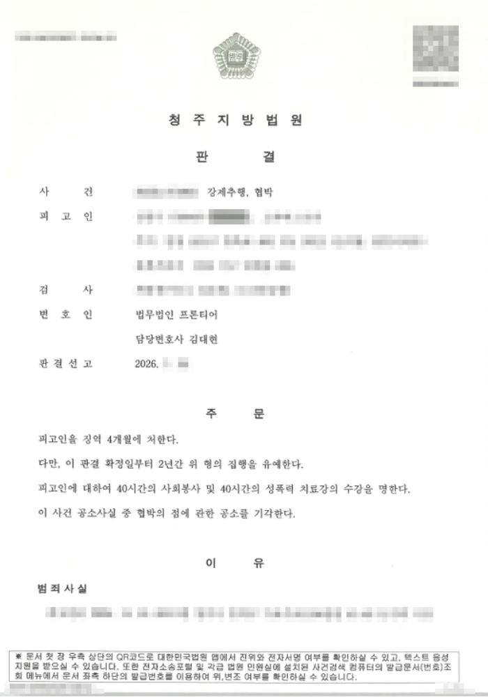 법무법인 프런티어의 청주강제추행변호사가 수행한 변론 끝에 법원은 의뢰인에게 징역 4개월에 집행유예 2년을 선고하였습니다. 이와 함께 사회봉사 40시간 및 성폭력 치료강의 수강 40시간이 부가되었으며, 신상정보 공개·고지 명령과 취업 제한 명령은 모두 면제되었습니다. 특히 함께 기소된 협박 혐의에 대해서는 공소가 기각되어 해당 부분에서는 형사책임을 지지 않는 결과를 얻었습니다.