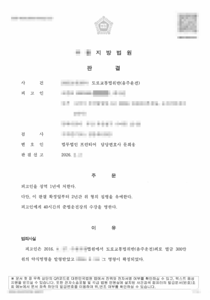 법원은 최종적으로 징역 1년에 집행유예 2년을 선고하였습니다. 아울러 40시간의 준법운전강의 수강을 명하였습니다. 혈중알코올농도 0.192%라는 높은 수치와 동종 전과가 존재하는 상황에서 실형이 아닌 집행유예를 이끌어낸 것은, 법무법인 프런티어의 인천음주운전변호사가 양형에 유리한 사정을 면밀히 정리하고 재판부를 설득한 결과였습니다.