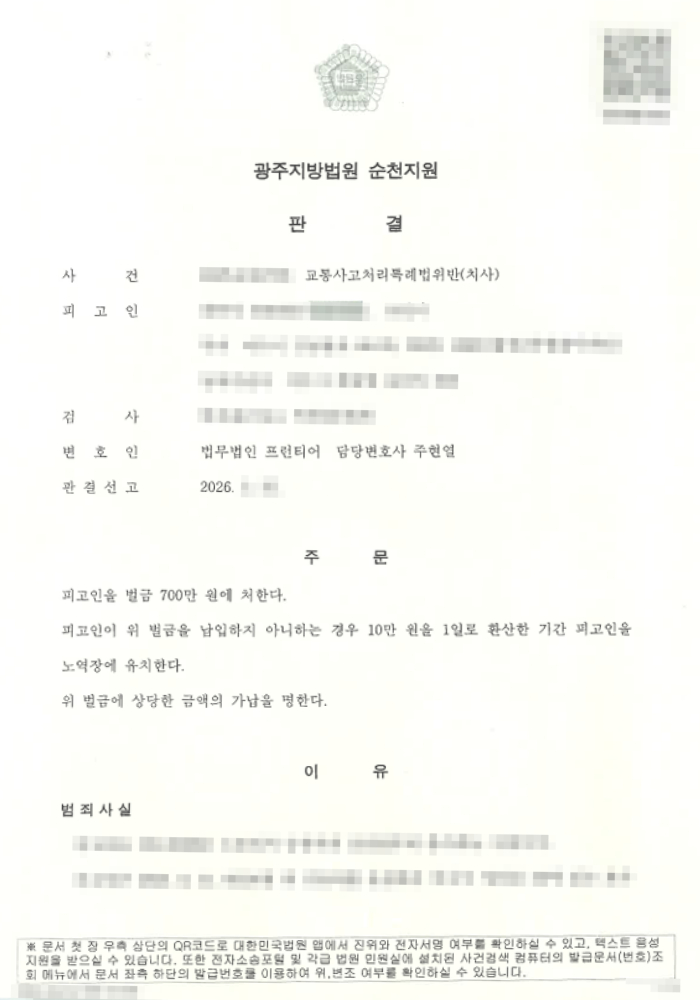 이번 결과는 여수교통사고변호사가 사건 초기부터 피해자 과실 주장과 합의 진행을 병행하며 체계적으로 변호를 수행한 덕분에 이끌어낼 수 있었습니다.