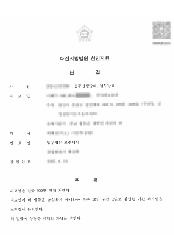 법원은 의뢰인에게 벌금 900만 원을 선고하였습니다. 공무집행방해죄와 업무방해죄가 경합된 사건으로, 자칫 징역형이나 집행유예로 이어질 수 있었던 사안이었으나 법무법인 프런티어의 적극적인 변론 활동과 피해자 합의, 양형 자료 제출 등을 통해 벌금형으로 마무리되는 결과를 이끌어냈습니다.