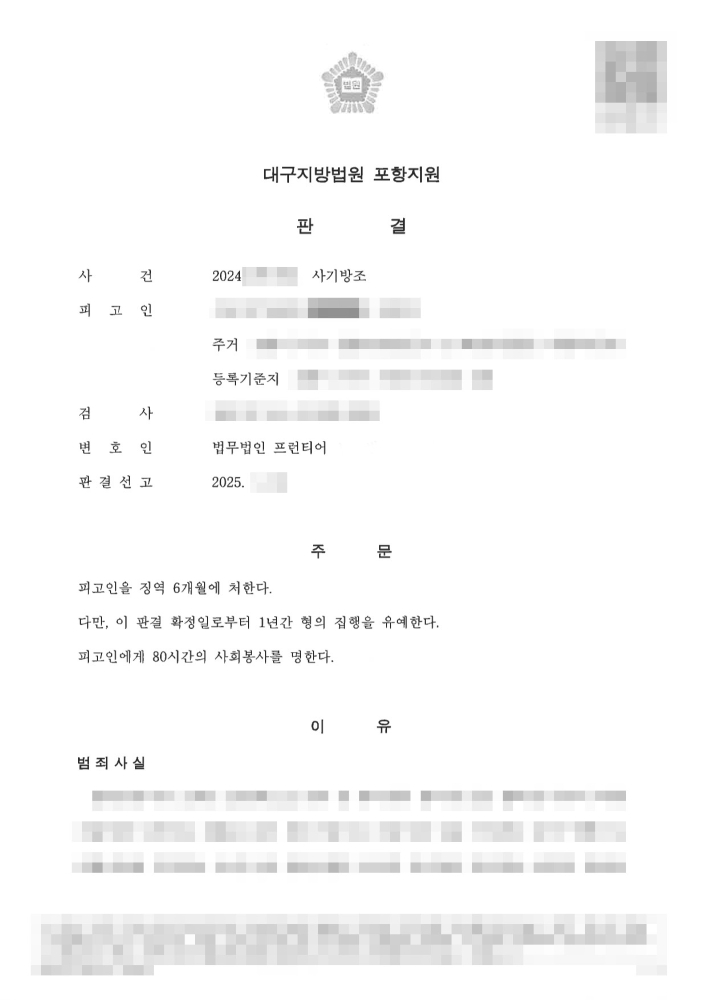 법원은 피고인에게 징역 6개월을 선고하면서도, 이 판결 확정일로부터 1년간 형의 집행을 유예하는 판결을 내렸습니다. 또한, 피고인에게 80시간의 사회봉사를 명했습니다. 이는 피고인이 사기방조라는 중한 범죄를 저질렀음에도 불구하고, 청주사기죄변호사의 적극적인 조력 덕분에 실형을 면하고 집행유예를 선고받을 수 있었던 성공적인 결과입니다.