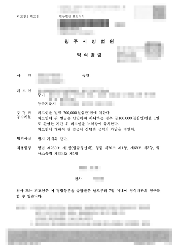 셋째, 천안폭행사건변호사는 법리적 주장을 통해 검찰을 설득했습니다. 폭행죄의 성립 자체는 인정하되, 피고인의 행위가 사회적으로 용인되는 수준을 크게 벗어나지 않으며, 범행 동기와 경위에 참작할 만한 사정이 있음을 강조하여 검찰이 정식재판을 청구하기보다는 약식명령으로 사건을 종결하도록 유도했습니다.