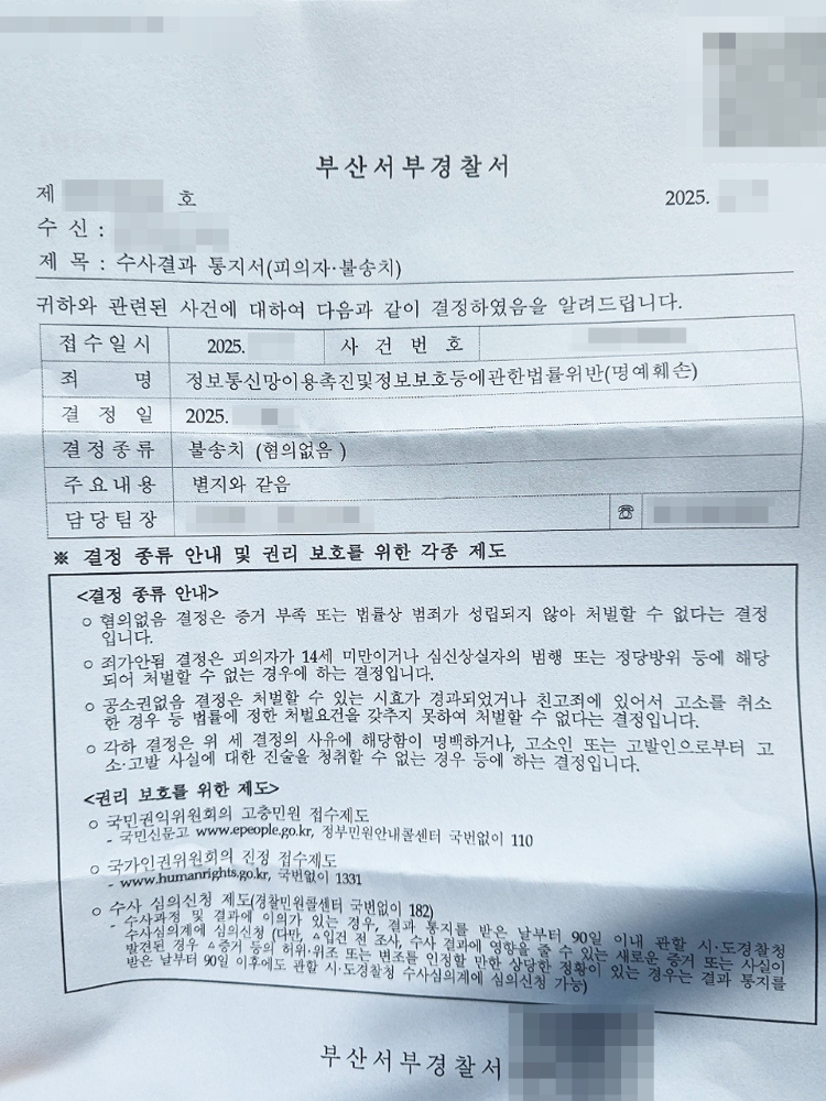 양산명예훼손변호사와 관련된 이 사건은 피의자에 대한 정보통신망이용촉진및정보보호등에관한법률위반(명예훼손) 혐의에 대한 것입니다. 해당 사건 수사를 진행한 경찰은 해당 사건에 대해 불송치(혐의없음) 결정을 내렸습니다.