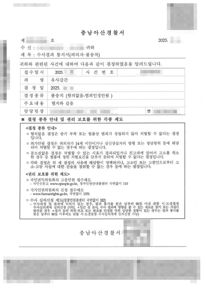 본 사건 피의자의 변호인은 법무법인 프런티어 소속 천안유사강간변호사입니다. 이 사건은 피의자가 성범죄 혐의로 입건되었으나, 천안유사강간변호사의 적극적인 법률 조력 덕분에 수사 단계에서 무혐의를 입증하고 형사 절차를 종결시킨 성공적인 방어 사례입니다. 성범죄 사건은 수사 초기 대응이 매우 중요함을 다시 한번 시사하고 있습니다.
