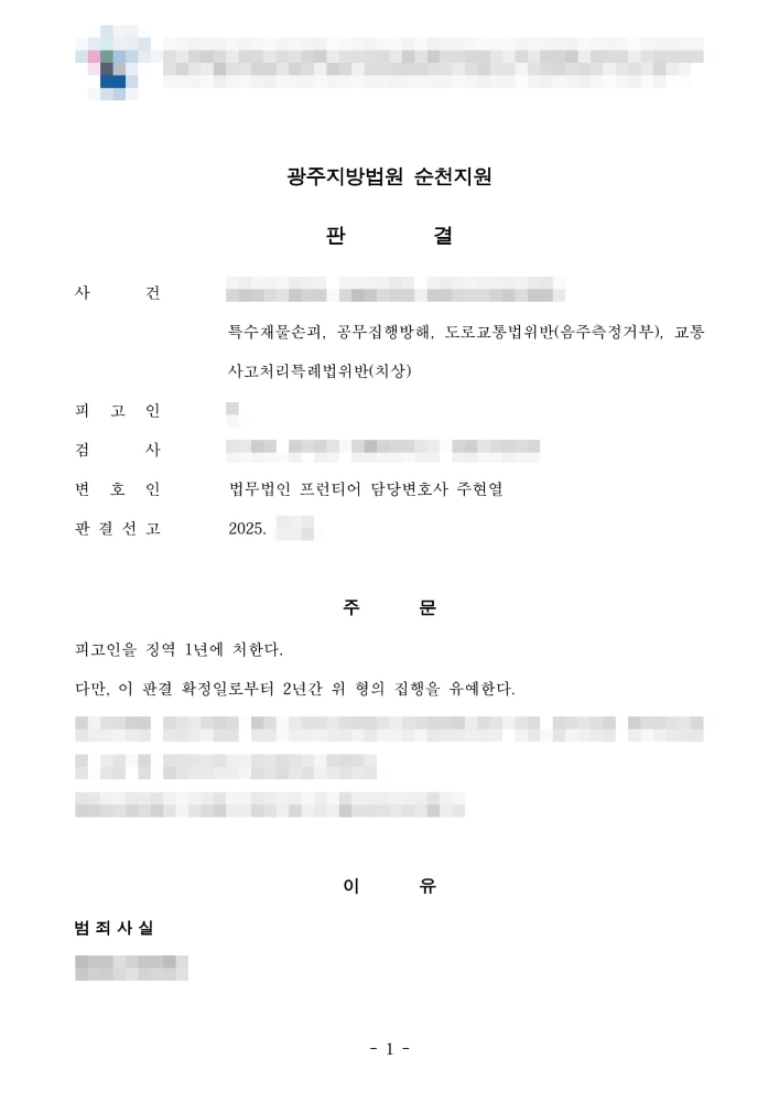 재판부는 피고인에게 징역 1년을 선고하면서, 다만, 이 판결 확정일로부터 2년간 위 형의 집행을 유예한다는 판결을 내렸습니다. 이는 피고인이 저지른 네 가지의 중대한 형사 범죄, 특히 12대 중과실 교통사고(치상), 특수재물손괴, 공무집행방해, 음주측정거부라는 복합적이고 중한 혐의에도 불구하고, 실형을 면하고 자유로운 상태에서 재활할 기회를 얻었다는 점에서 여수교통사고변호사의 조력이 성공적이었음을 보여주는 결과입니다. 법원의 이러한 판단은 집행유예라는 유리한 결정을 내리면서도, 향후 재범 방지를 위한 강력한 조건을 부과한 것으로 볼 수 있습니다.