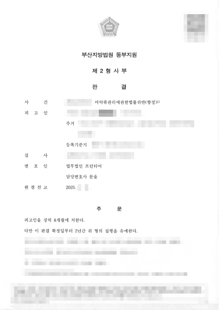 결과적으로 피고인은 권고형의 하한인 징역 8개월을 선고받았으나, 부산케타민변호사의 적극적인 조력과 법원의 판단에 따라 집행유예가 인정되어 구금되지 않고 사회 내에서 형을 유예받게 되었습니다. 이러한 집행유예는 피고인이 죄질의 불리한 사정(마약류 범죄의 중대성)에도 불구하고, 유리한 사정들을 적극적으로 입증하여 얻어낸 최선의 결과라고 볼 수 있습니다.
