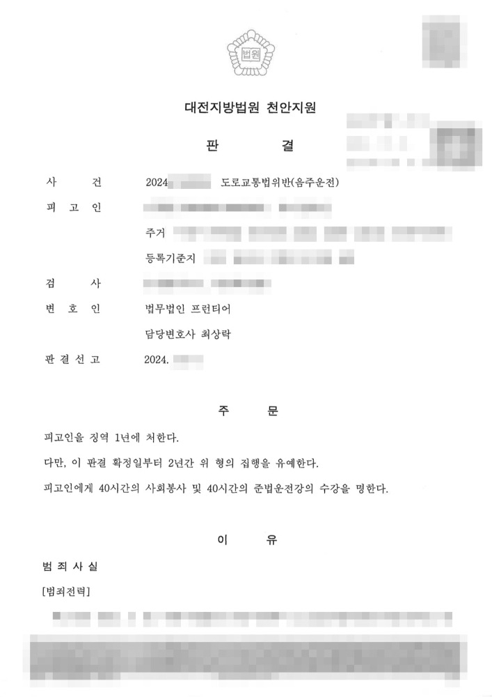 이처럼 음주운전 재범임에도 불구하고 실형을 면하고 집행유예를 받은 것은 천안아산음주운전변호사의 조력이 있었기에 가능한 결과입니다. 음주운전 재범은 원칙적으로 엄격하게 처벌되므로, 자칫 잘못하면 구속되거나 실형을 선고받을 수 있습니다. 그러나 천안아산음주운전변호사는 피고인의 상황을 면밀히 분석하고, 재판부에 유리한 양형 자료를 제출하는 등 최선의 노력을 다했습니다.