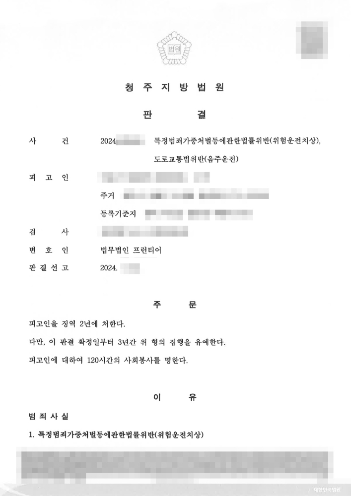 부산해운대구음주운전변호사의 도움으로 집행유예를 받은 이번 사건은 단순 음주운전을 넘어, 음주로 인해 정상적인 운전이 곤란한 상태에서 교통사고를 일으켜 타인에게 상해를 입힌 혐의(특정범죄 가중처벌 등에 관한 법률 위반_위험운전치상)와 도로교통법 위반(음주운전) 혐의가 동시에 적용된 중대 사안이었습니다. 피고인은 새벽 시간 혈중알코올농도 0.233%의 만취 상태로 약 2km를 운전하다가 교차로에서 좌회전하던 피해자의 차량을 들이받았습니다. 이 사고로 피해자는 약 3주간의 치료가 필요한 경추의 염좌 및 긴장 등의 상해를 입게 되었습니다. 일반적으로 혈중알코올농도 0.2% 이상은 면허취소 수치 중에서도 가장 높은 단계로, 사고까지 발생한 경우 구속수사 및 실형 선고의 가능성이 매우 높은 상황입니다.