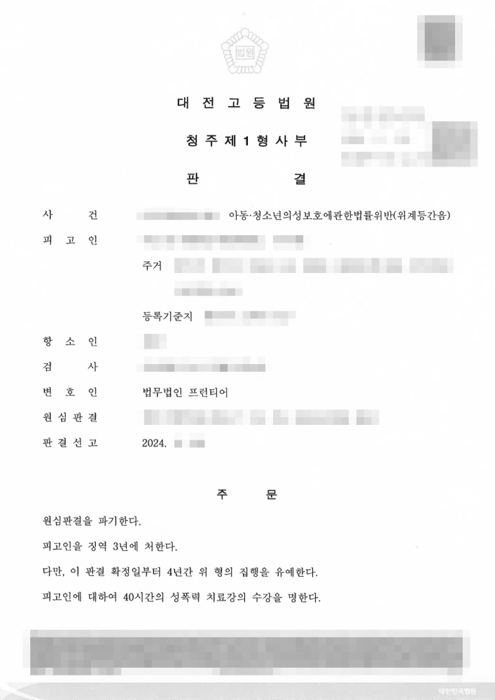 항소심 재판부는 원심 판결을 파기하고 피고인에게 징역 3년에 집행유예 4년을 선고했습니다. 또한, 성폭력 치료강의 수강과 아동·청소년 관련기관 등 취업제한 명령을 유지했습니다. 이 판결은 위계등간음이라는 중범죄에 대해 실형 대신 집행유예를 선고함으로써, 피고인에게 재기할 수 있는 기회를 주었다는 점에서 매우 의미가 큽니다. 재판부는 판결문에서 피고인이 범행을 인정하고 반성하고 있으며, 특히 항소심에 이르러 피해자와 합의하여 피해자가 피고인의 처벌을 원하지 않는다는 의사를 밝힌 점을 유리한 정상으로 명시했습니다. 이러한 판결 결과는 부산아청법위반변호사의 전문적인 조력이 얼마나 큰 영향을 미쳤는지 보여줍니다.