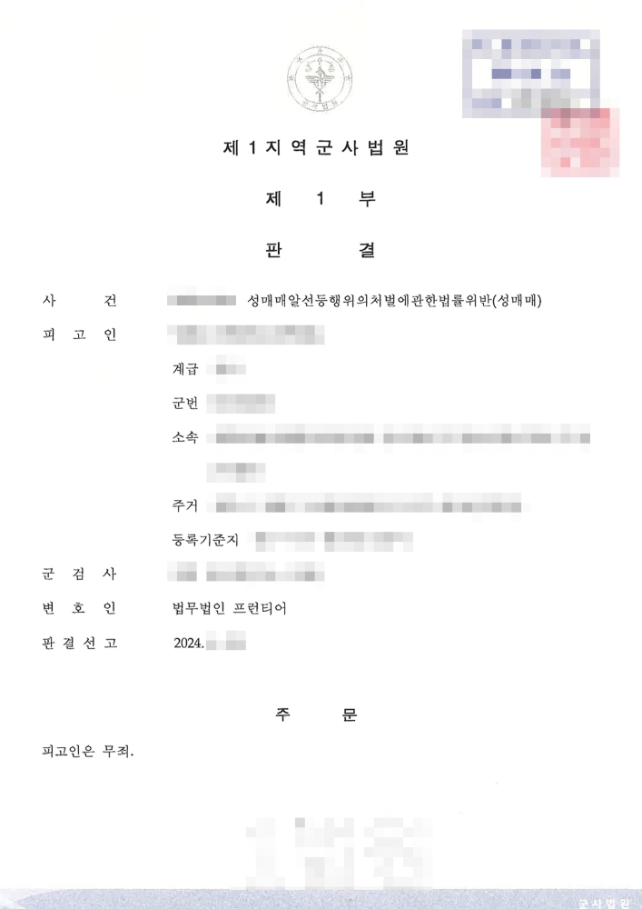 군사법원은 여수성매매변호사의 주장을 받아들여, 군 검사가 제출한 증거만으로는 피고인이 유사 성교 행위를 했다는 사실이 합리적 의심을 배제할 만큼 증명되지 않았다고 판단했습니다. 업주의 영업 장부 기록은 단순히 결제가 이루어졌다는 사실만을 증명하며, 종업원의 진술 역시 일관되지 않아 신빙성이 부족하다고 보았습니다. 이에 따라, 군사법원은 피고인에게 무죄를 선고했습니다. 군사법원법 제380조에 따라 범죄의 증명이 없는 경우에 해당한다는 이유였습니다. 무죄 판결의 요지는 형법 제58조 제2항 단서에 따라 공시되지 않았습니다.