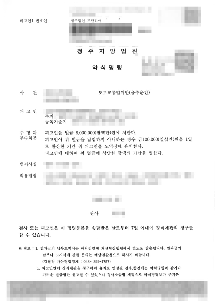 이 사건의 최종 결과는 피고인에게 벌금 800만원을 선고하는 약식명령이었습니다. 이는 징역형을 받을 수도 있었던 중대한 음주운전 사건에서 벌금형이라는 비교적 가벼운 처벌을 이끌어냈다는 점에서 주목할 만한 결과입니다. 벌금 800만원은 법정 최고 벌금형인 1,000만원에 미치지 않는 금액으로, 피고인의 상황을 적극적으로 변론한 결과라고 볼 수 있습니다. 만약 피고인이 벌금을 납부하지 않을 경우, 100,000원을 1일로 환산하여 노역장에 유치된다는 부수처분도 함께 명시되었습니다.