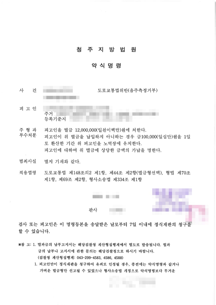 청주음주측정거부변호사의 적극적인 조력 덕분에 피고인은 징역형의 위기에서 벗어나 벌금형으로 사건을 마무리할 수 있었습니다. 검찰은 약식기소 과정에서 피고인에게 벌금 1,200만 원을 구형했고, 재판부는 이를 받아들여 약식명령으로 벌금 1,200만 원을 선고했습니다. 이는 동종 전과가 있음에도 불구하고 징역형이 아닌 벌금형으로 사건이 종결된 이례적인 결과로, 청주음주측정거부변호사의 조력이 있었기에 가능했던 일이었습니다. 이 사건은 음주운전 단속 시 음주측정거부 혐의로 입건되었을 때, 안일하게 대처해서는 안 된다는 것을 명확히 보여줍니다. 음주측정거부는 법적으로 엄중히 처벌될 뿐만 아니라, 억울한 사정이 있더라도 제대로 된 법률 조력을 받지 못하면 무거운 처벌을 피하기 어렵습니다.