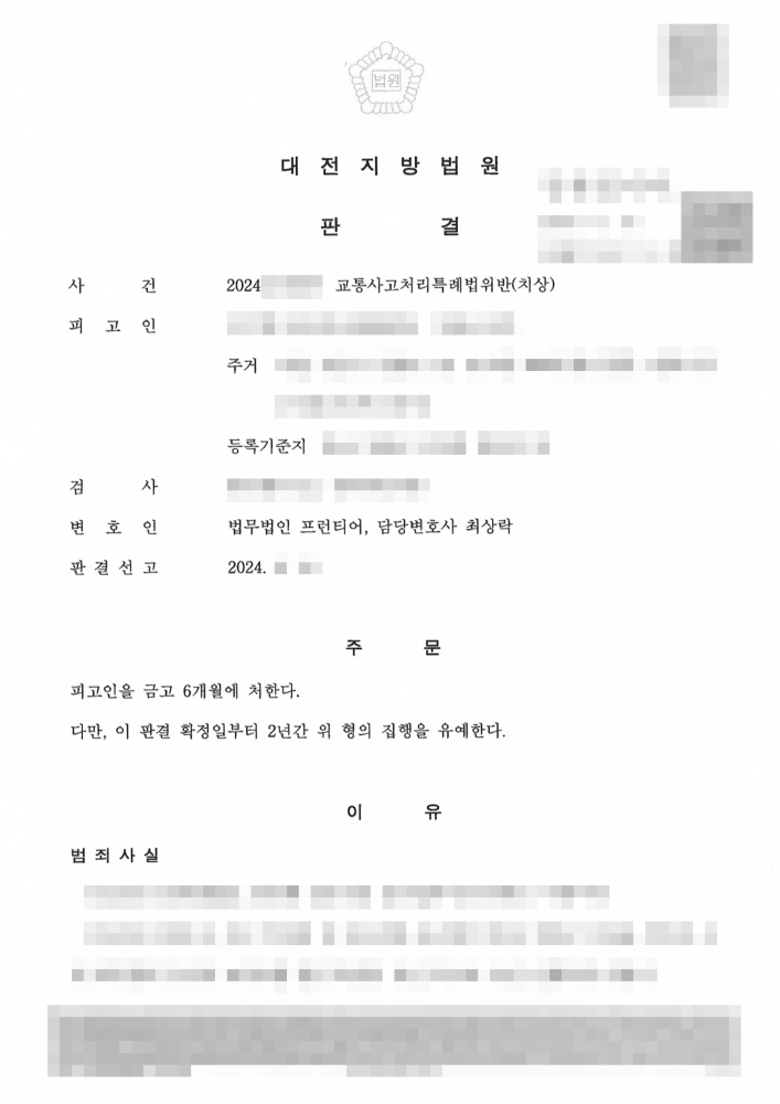 천안교통사고처리특례법위반변호사의 전문적인 조력 덕분에 피고인은 실형을 면하고 집행유예를 선고받았습니다. 법원은 피고인에게 금고 6개월에 집행유예 2년을 선고했습니다. 이는 피고인이 실제 교도소에 수감되지 않고, 2년간의 유예 기간 동안 별다른 범죄를 저지르지 않으면 형이 소멸되는 매우 유리한 판결입니다. 특히 이 사건은 12대 중과실에 해당하는 신호위반으로 인해 3명의 피해자가 발생하고 그 중 2명이 중상을 입은 매우 중한 사건이었음에도 불구하고, 실형을 피하고 집행유예를 얻어냈다는 점에서 천안교통사고처리특례법위반변호사의 역할이 매우 중요했음을 알 수 있습니다.