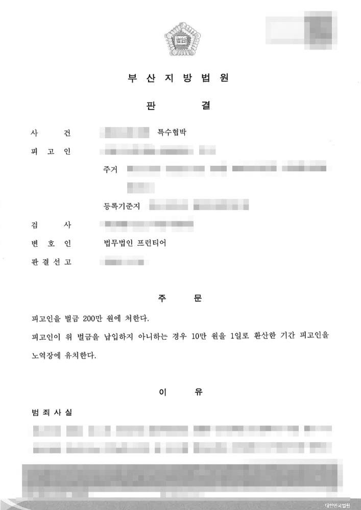 부산특수협박변호사의 전문적인 변론 덕분에 피고인은 특수협박 혐의에도 불구하고 벌금 200만 원이라는 비교적 경미한 형을 선고받았습니다. 이는 실형이 선고될 가능성이 높았던 상황에서 얻어낸 매우 성공적인 결과입니다. 판결문은 피고인이 범행을 부인하고 있지만, 사건 현장의 교통 상황과 피고인의 운전 경력, 그리고 피해자 역시 과민하게 반응한 점 등 여러 양형 사유를 참작하여 벌금형을 선고했다고 명시하고 있습니다.