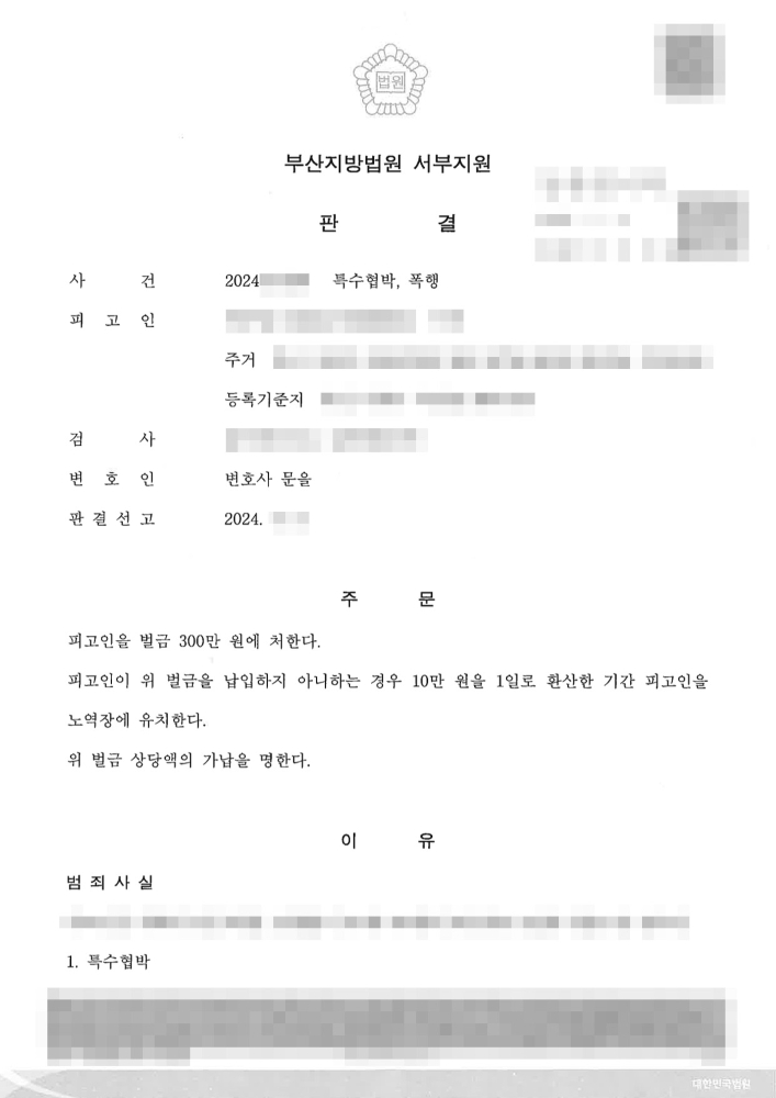 부산특수협박변호사가 다룬 이 사건은 피고인이 배우자인 피해자에게 특수협박 및 폭행을 가하여 벌금형을 선고받은 사례입니다.