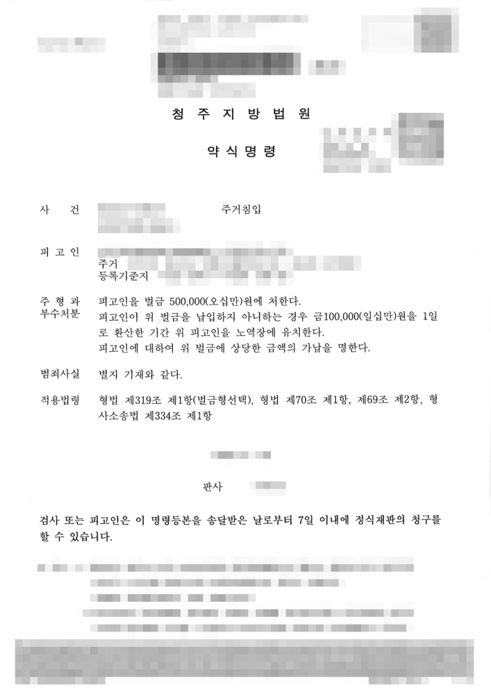 강동형사전문변호사의 면밀하고 체계적인 조력 덕분에 피고인의 주거침입 사건은 긍정적인 결과를 얻을 수 있었습니다. 법원은 주거침입 사건에 대한 약식명령을 통해 피고인에게 벌금 500,000원에 처한다는 결정을 내렸습니다. 이는 형법 제319조 제1항에서 정하는 주거침입죄의 법정형 중 벌금형을 선택한 것으로, 피고인의 방어권과 정상 참작 사유들이 법원에 충분히 전달되었음을 의미합니다. 벌금형은 징역형과 달리 사회생활을 지속할 수 있다는 점에서 피고인에게 미치는 불이익이 상대적으로 적습니다. 만약 벌금형을 납입하지 아니할 경우, 금 100,000원을 1일로 환산한 기간 동안 노역장에 유치된다는 부수처분도 함께 명시되었습니다.