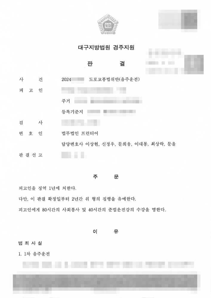 음주운전 사건에서 집행유예는 단순히 법정 구속을 면하는 것을 넘어, 피고인이 사회에서 자숙하고 재활할 수 있는 기회를 얻는다는 점에서 매우 중요한 의미를 가집니다. 특히 본 사건과 같이 음주운전 전력이 있고 혈중알코올농도 수치가 높은 경우, 실형 선고의 가능성이 매우 높으므로 집행유예 판결은 상당한 법률적 성과로 평가될 수 있습니다. 이 사건을 통해 알 수 있듯이 음주운전은 가볍게 여길 수 없는 중대한 범죄이며, 만약 음주운전으로 적발되어 법적 위기에 처했다면 반드시 양산음주운전변호사와 같은 전문 변호인의 조력이 필요합니다.