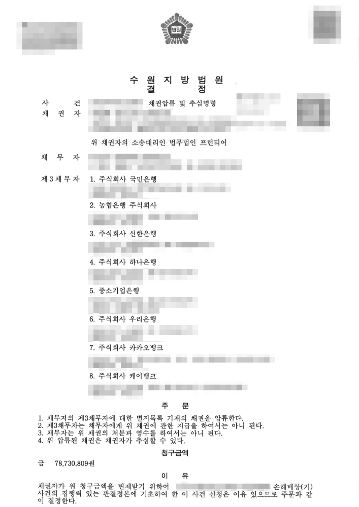 이러한 결과는 채권추심 사건에서 부산채권추심변호사의 전문적인 조력이 얼마나 중요한지를 여실히 보여줍니다. 채권추심은 단순한 법적 절차가 아니라, 채무자의 재산 상태를 정확히 파악하고, 법률적 근거를 바탕으로 최적의 집행 방법을 선택하며, 복잡한 법원 절차를 효율적으로 관리해야 하는 고도의 전문성을 요구하는 분야입니다. 일반 채권자가 홀로 이러한 과정을 진행하기에는 정보의 부족, 법률적 지식의 한계, 절차상의 오류 등으로 인해 어려움을 겪거나 시간과 비용을 낭비할 가능성이 매우 높습니다. 특히 본 사건처럼 채무자가 다수의 제3채무자에 분산하여 재산을 보유하고 있거나, 채무자가 재산 은닉을 시도할 우려가 있는 경우 부산채권추심변호사의 신속하고 정확한 대응이 없다면 채권 회수가 불가능해질 수도 있습니다. 따라서 손해배상 채권과 같이 정당하게 받아야 할 돈을 돌려받지 못하고 있다면, 시간을 지체하지 말고 부산채권추심변호사의 조력을 받아 적극적으로 채권 회수를 위한 법적 절차를 진행하는 것이 무엇보다 중요합니다. 전문 변호사의 도움을 통해 복잡한 채권추심 절차를 성공적으로 이끌고, 소중한 자신의 권리를 되찾으시길 바랍니다.