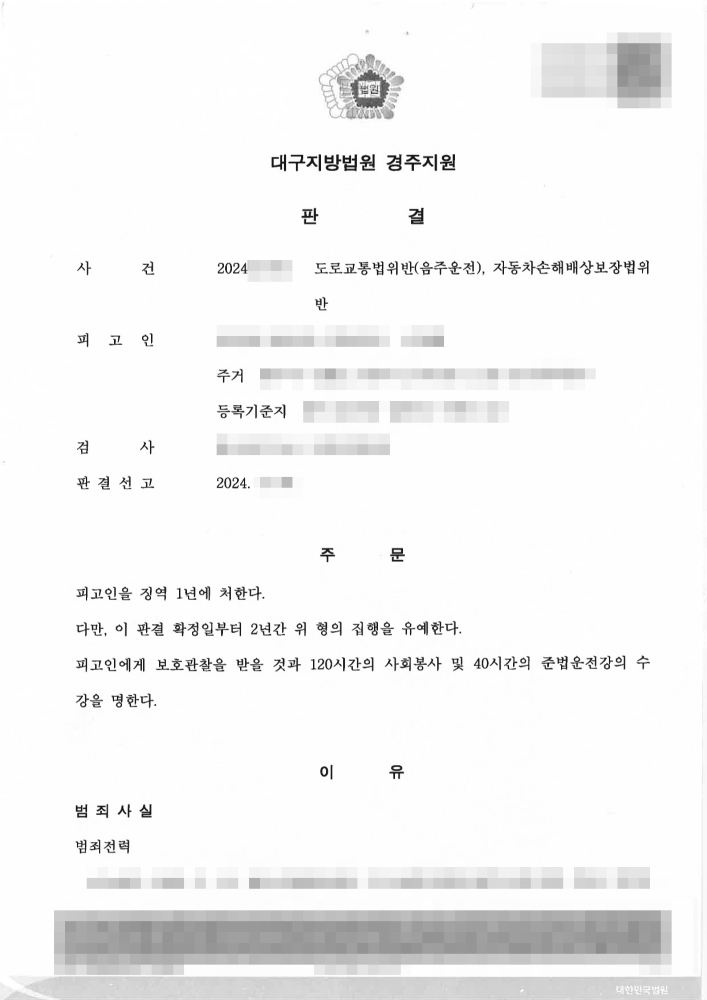 법원은 피고인에게 징역 1년이라는 실형을 선고하면서도, 이 판결 확정일로부터 2년간 위 형의 집행을 유예하는 파격적인 판결을 내렸습니다. 또한, 피고인에게 보호관찰을 받을 것과 120시간의 사회봉사, 그리고 40시간의 준법운전강의 수강을 명했습니다. 이는 피고인이 음주운전 재범이라는 불리한 정상과 높은 혈중알코올농도 수치에도 불구하고, 여수음주운전전문변호사의 전문적인 변론을 통해 실형을 면하고 사회생활을 이어갈 기회를 얻게 된 매우 의미 있는 결과입니다.