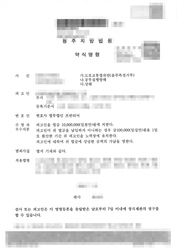 부평구형사전문변호사의 체계적이고 전문적인 조력 덕분에, 피고인은 음주측정거부, 공무집행방해, 상해라는 세 가지 중대 혐의에도 불구하고 벌금 10,000,000원(일천만 원)의 약식명령 처분을 받는 결과를 얻어낼 수 있었습니다. 이는 피고인에게 징역형의 실형 또는 집행유예가 아닌 벌금형이 선고되어 피고인의 신분과 직장 생활에 미치는 영향을 최소화하고 법정 구속의 위험에서 벗어나게 했다는 점에서 매우 성공적인 결과로 평가됩니다.