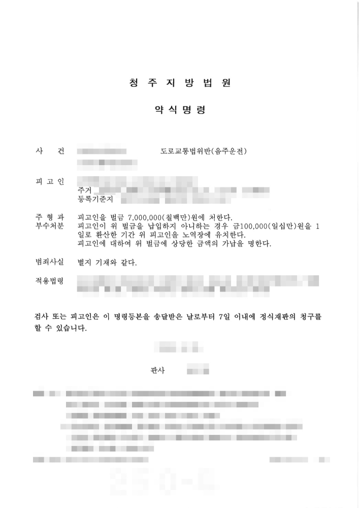 법원은 피고인의 도로교통법위반(음주운전) 사건에 대해 약식명령을 내렸습니다. 법원은 피고인에게 벌금 7,000,000원(칠백만 원)에 처한다는 주형을 선고했습니다. 이는 음주운전 재범이라는 매우 불리한 조건에도 불구하고, 실형이 아닌 벌금형으로 사건을 마무리 지은 결과입니다. 통상적으로 음주운전 재범의 경우 징역형의 집행유예 또는 실형이 선고될 가능성이 높다는 점을 고려할 때, 경주음주운전변호사의 전문적인 조력과 철저한 양형 변론이 있었기에 이처럼 선방한 벌금형이라는 결과를 얻어낼 수 있었다고 평가할 수 있습니다.