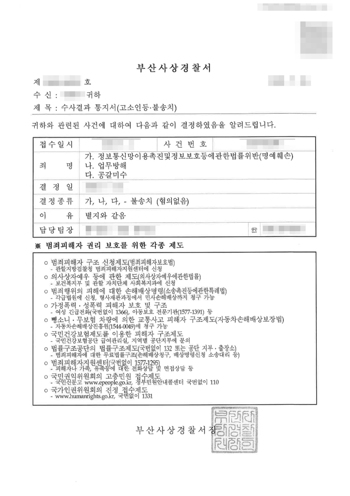 부산업무방해죄변호사의 체계적이고 전문적인 법리 방어를 바탕으로, 수사기관은 고소인이 제기한 세 가지 혐의에 대해 모두 불송치(혐의없음) 결정을 내렸습니다. 이는 피의자가 명예훼손, 업무방해, 공갈미수 혐의에 대한 모든 의혹을 벗고 일상으로 복귀할 수 있게 된 성공적인 결과였습니다.