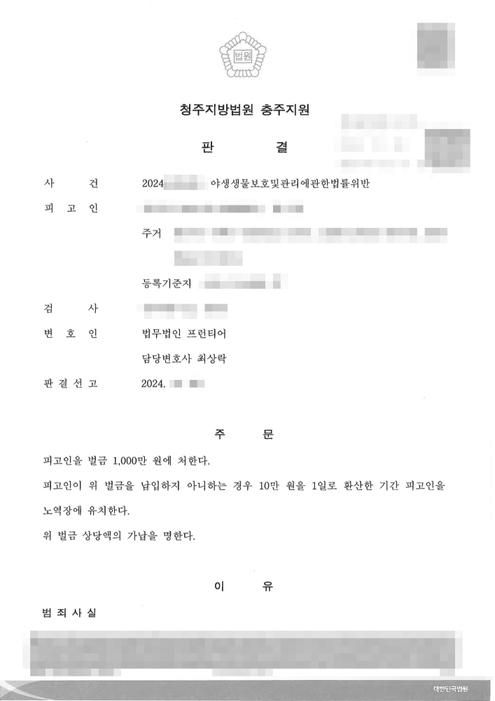 법원은 이 사건 피고인에게 「야생생물 보호 및 관리에 관한 법률」 위반 혐의에 대해 최종적으로 벌금 1,000만 원을 선고하는 것으로 판결을 확정하였습니다. 피고인에게 중대한 범행 사실이 인정되었고, 더욱이 그 결과로 양수받은 자가 상해를 입는 사고까지 발생했으며, 동종 전력(기소유예)까지 존재했다는 점을 고려하면, 징역형의 실형 선고 가능성이 매우 높았던 사건이었습니다. 검찰의 구형 역시 이러한 사안의 중대성을 반영하여 엄중했을 것으로 예상됩니다.