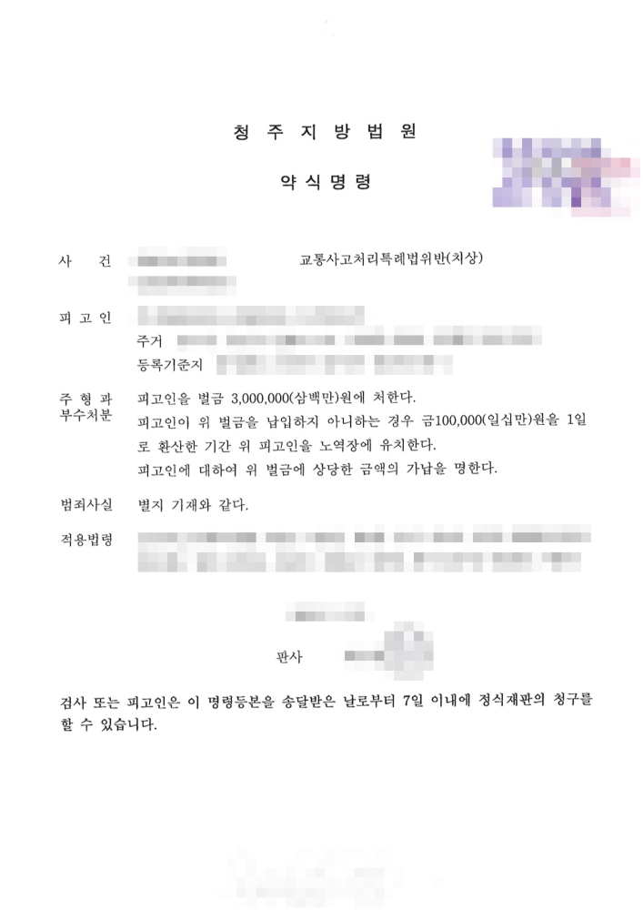 약식명령 대응: 이 사건처럼 검사가 벌금형으로 약식기소하고, 법원이 이를 받아들여 약식명령을 내린 경우, 인천교통사고처리특례법위반변호사는 선고된 벌금 300만 원이 피고인의 사안에 비추어 적정한지 판단합니다. 만약 벌금액이 과도하다고 판단되거나, 피고인이 정식재판을 통해 무죄나 더 낮은 형을 다투고자 할 경우, 송달받은 날로부터 7일 이내에 정식재판 청구를 할 수 있도록 법적 조언과 절차를 대행합니다.