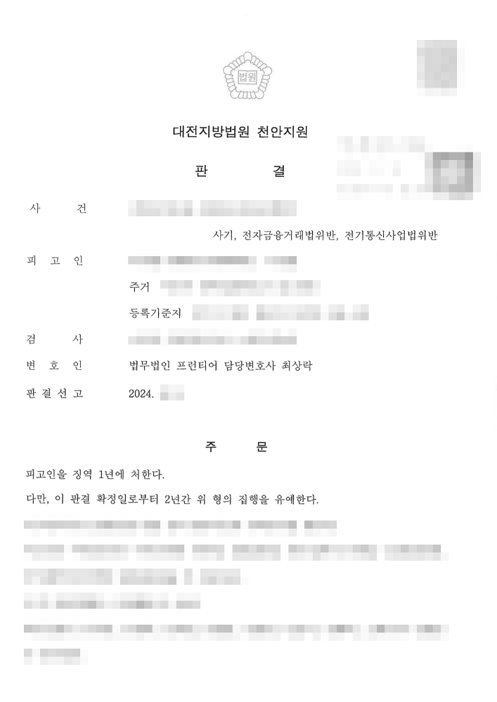 당진사기전문변호사는 피고인이 저지른 사기, 전자금융거래법위반, 전기통신사업법위반이라는 복합적인 혐의에 대해 전략적인 법률 조력을 제공했습니다. 이 사건은 단일 혐의가 아닌 경합범(여러 죄를 동시에 저지른 경우)일 뿐만 아니라, 피고인이 동종 범죄 전력이 있고 심지어 기존 집행유예 기간 중에 발생했다는 점에서 매우 불리한 양형 조건이었습니다.