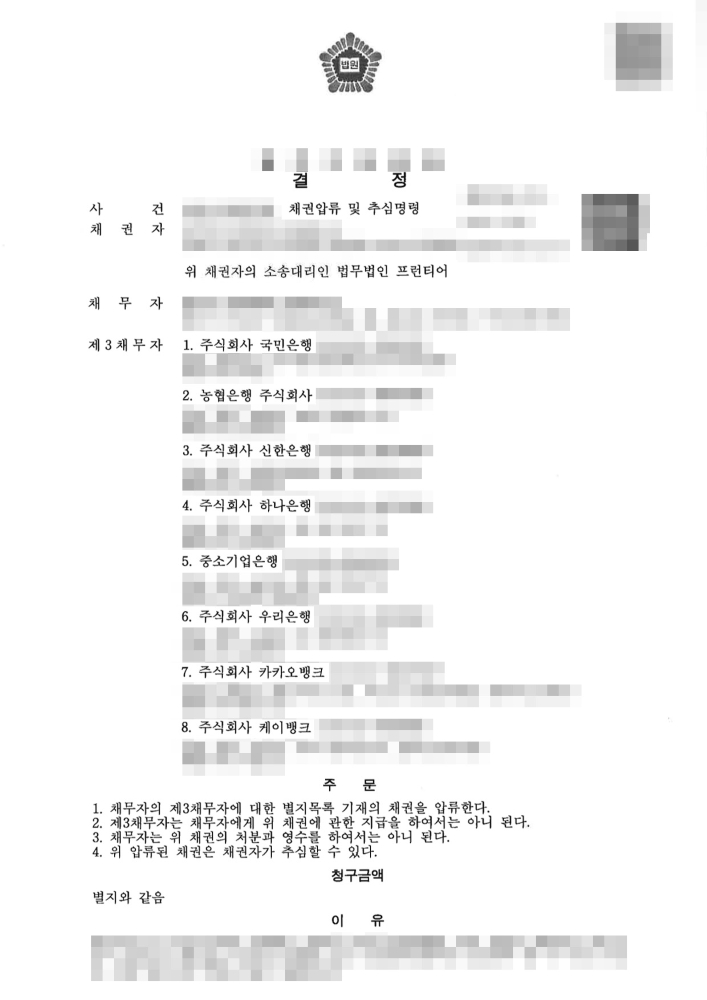 신속하고 확정적인 채권 회수: 채무자의 가장 유동성이 높은 재산인 예금을 압류하였기 때문에, 제3채무자인 은행들은 법원 결정에 따라 해당 금액을 채무자에게 지급하는 것이 금지됩니다. 채권자는 은행에 추심권을 행사하여 청구금액을 직접 지급받게 되므로, 채권 회수가 매우 신속하고 확실하게 이루어집니다.