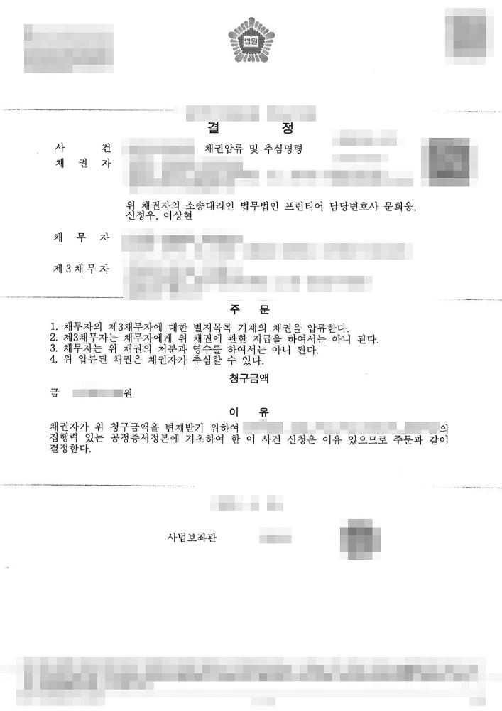 완벽한 법적 절차 이행: 신청서 작성, 법원 제출, 제3채무자 및 채무자에 대한 송달, 그리고 추심금 수령 후의 추심신고 의무 이행에 이르기까지 모든 후속 조치를 대리하여 채권자가 법적 위험 없이 채권을 회수하도록 보장합니다.
